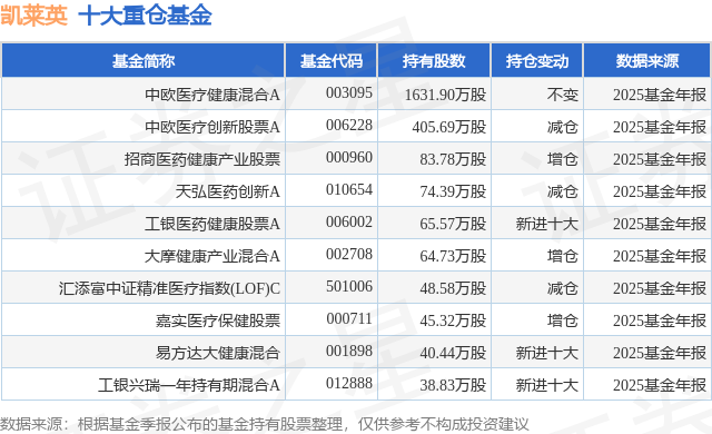 根据2025基金年报公募基金重仓股数据,重仓该股的公募基金共26家,其中持有数量最多的公募基金为中欧基金的中欧医疗健康混合A。中欧医疗健康混合A目前规模为138.43亿元,最新净值1.6676(3月3日),较上一交易日下跌2.6%,近一年上涨5.4%。该公募基金现任基金经理为葛兰 赵磊。葛兰在任的基金产品包括:中欧明睿新起点混合,管理时间为2018年7月12日至今,期间收益率为91.71%;中欧医疗创新股票A,管理时间为2019年2月28日至今,期间收益率为39.93%。赵磊在任的基金产品包括:中欧医药生物混合发起A,管理时间为2025年11月26日至今,期间收益率为-7.7%。